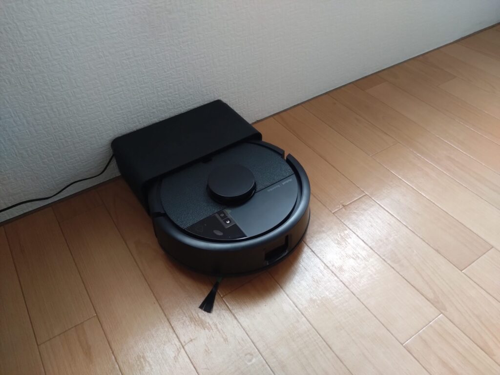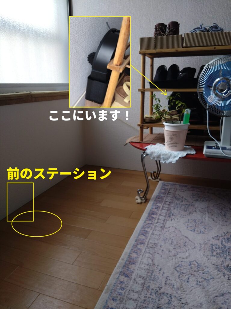 充電ステーションを床に置いてみましたが、自動で戻らなくても別によいので、立てて隠してみました。