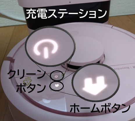 本体のボタンは2つ。りんごのような電源ボタンはクリーンボタンと呼ばれ、これをぽちっとすれば運転開始です。また運転中に押すと一時停止、再度押すと運転再開します。「クリーニング完了」すると、自動で充電ステーションに帰ります。ステーション接続中にホームボタンを押すとゴミの回収、動作中に押すと掃除をやめてステーションに戻ります。